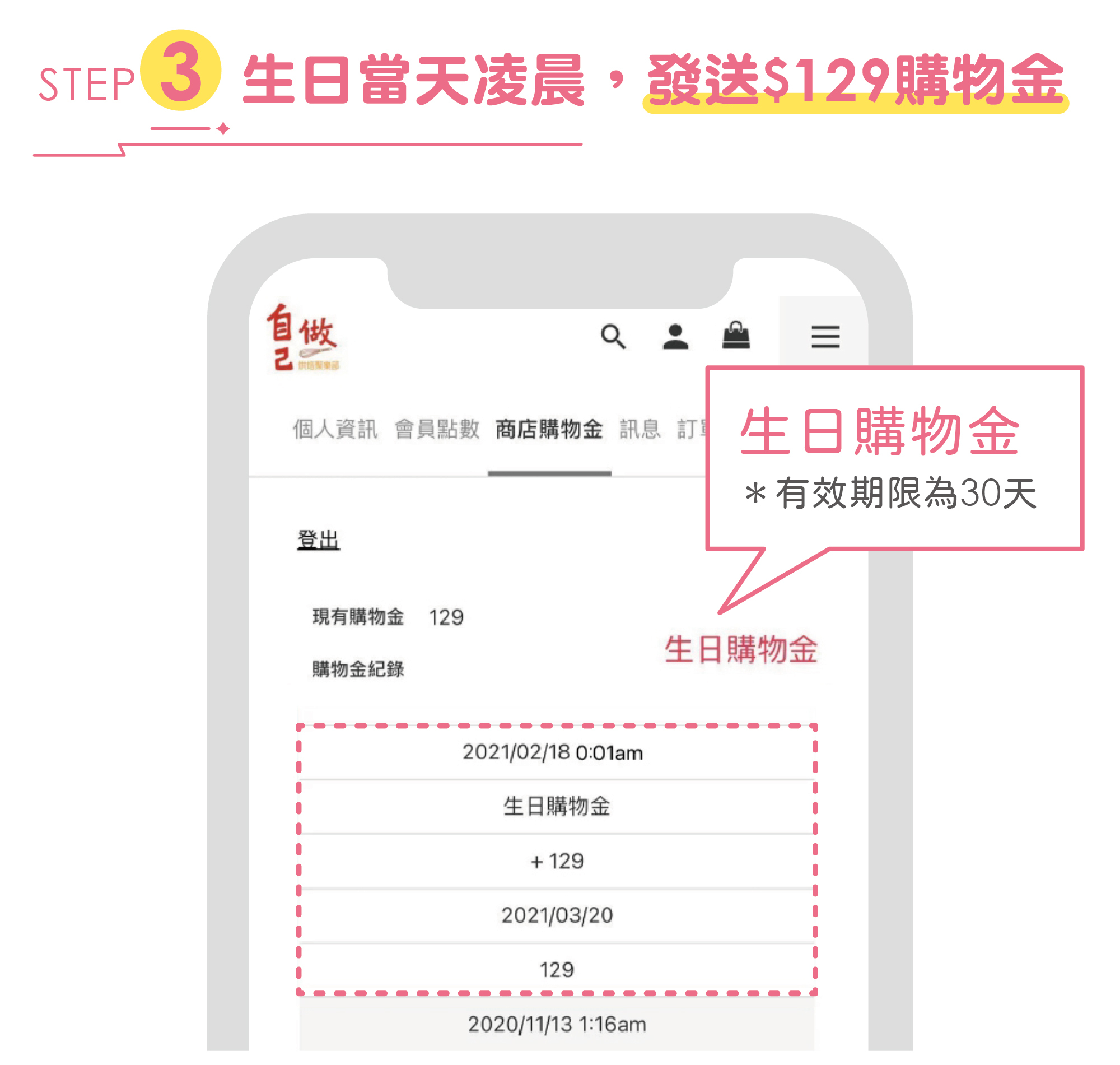 4. 會員於註冊時填寫生日資料,可於生日當天00:00獲得「生日購物金$129」,使用期限為30天內。