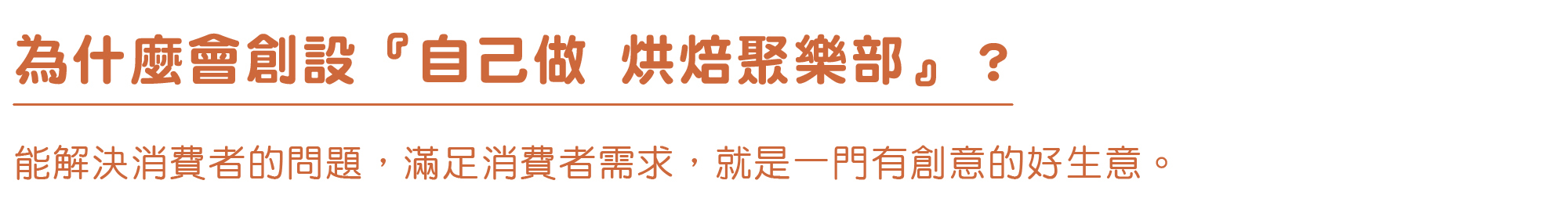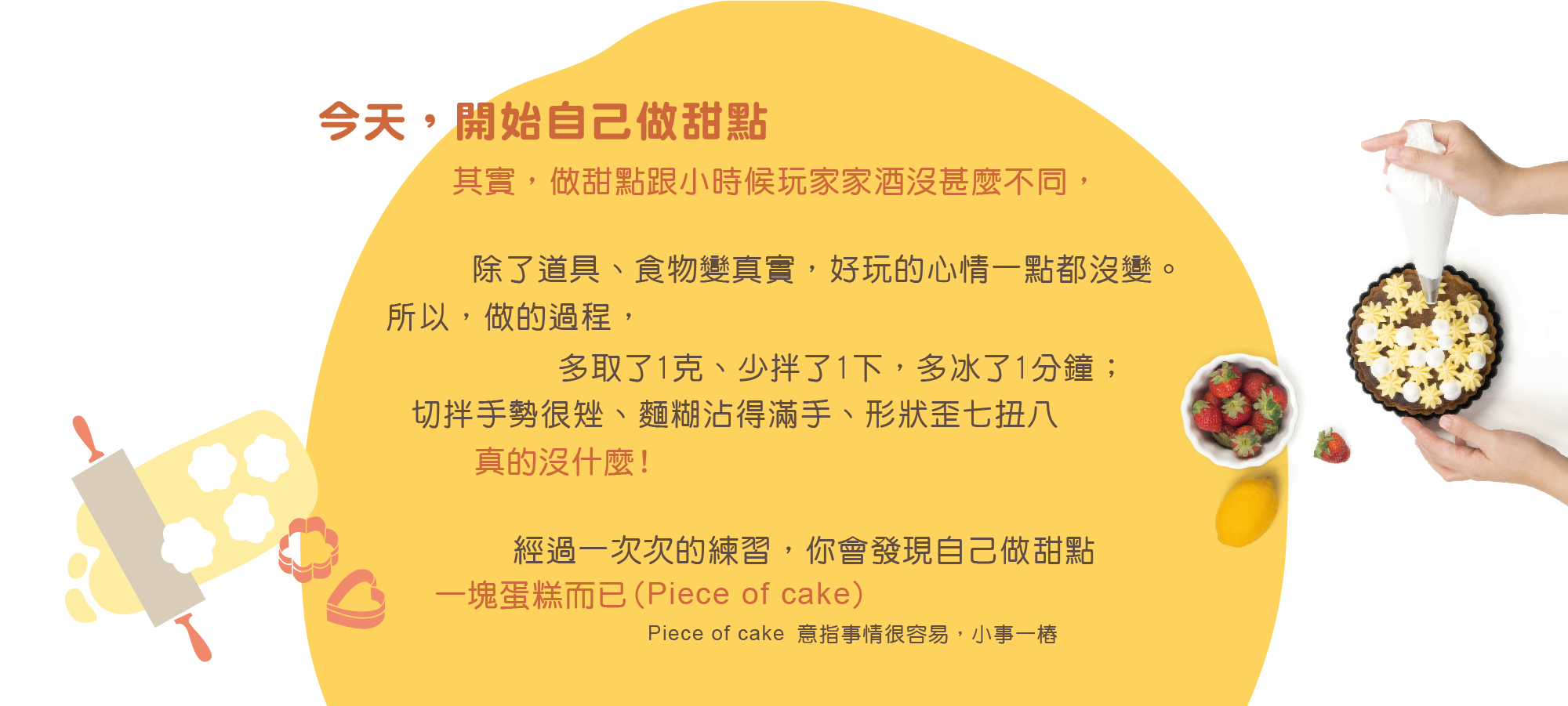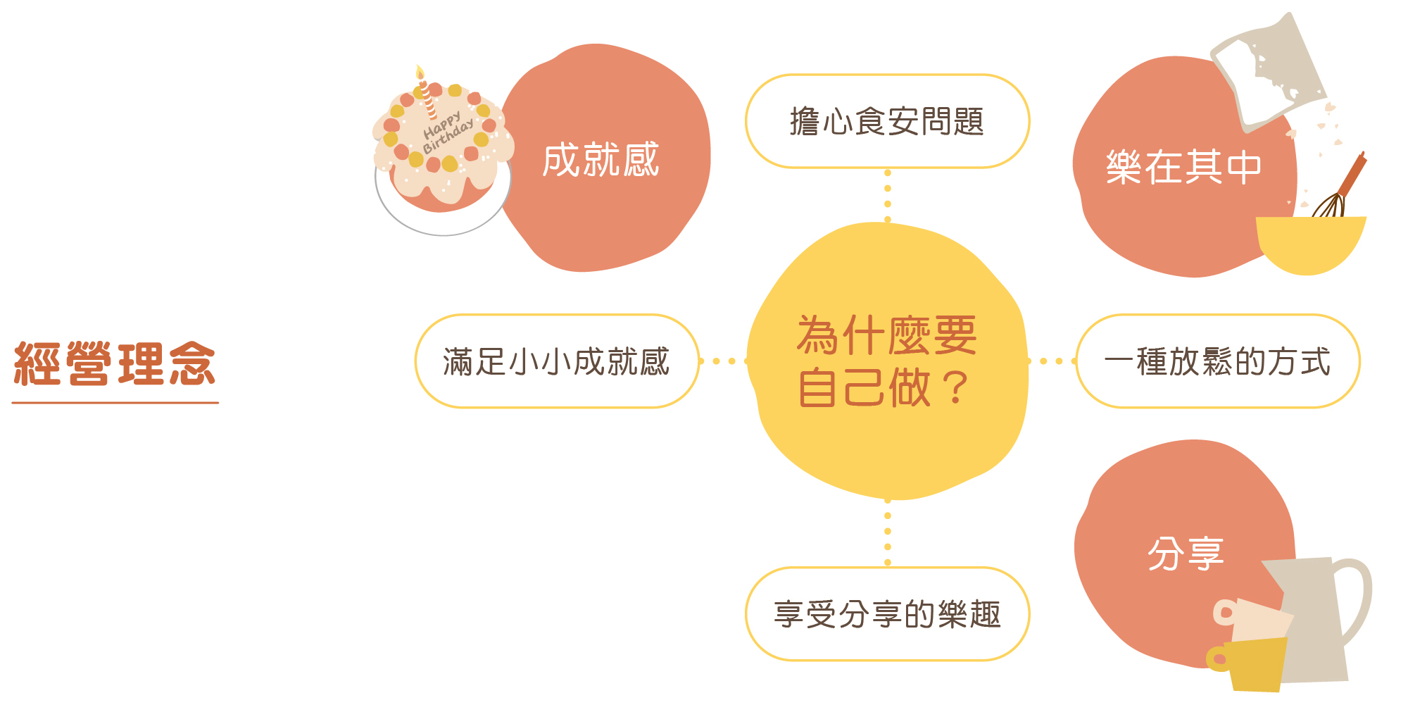 然而一次生日聚會中,有朋友分別帶了自製檸檬派、手工餅乾,雖謙稱做得不好,卻獲得眾人讚賞,朋友也覺得很開心….這次的經驗,讓兩人思考:如何讓做甜點變成簡單上手的全民休閒活動?之後便開啟了「自己做」創業旅程。