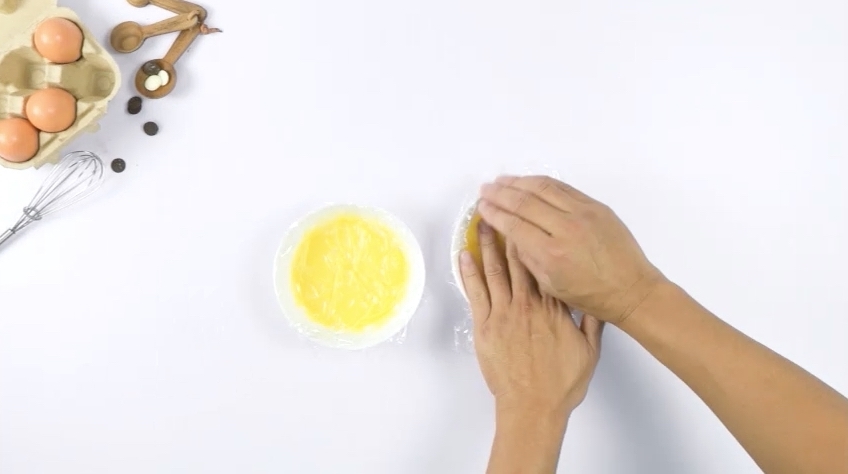 因為一層硬硬的結皮影響口感嗎?記得在內餡入模後,務必要將保鮮膜「服貼」在內餡表面(意思是:保鮮膜會貼到你的內餡上),不是像包剩菜那樣的包保鮮膜,這樣除了可以避免水蒸氣滴落在凝乳中,還可以避免表面結皮唷!