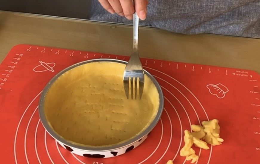 派皮入模後底部要用叉子戳洞,派皮烘烤時需要排熱氣,如果沒有戳洞,會讓熱氣無法排出,導致派皮底部隆起(嚴重的話,可能會直接裂掉)。